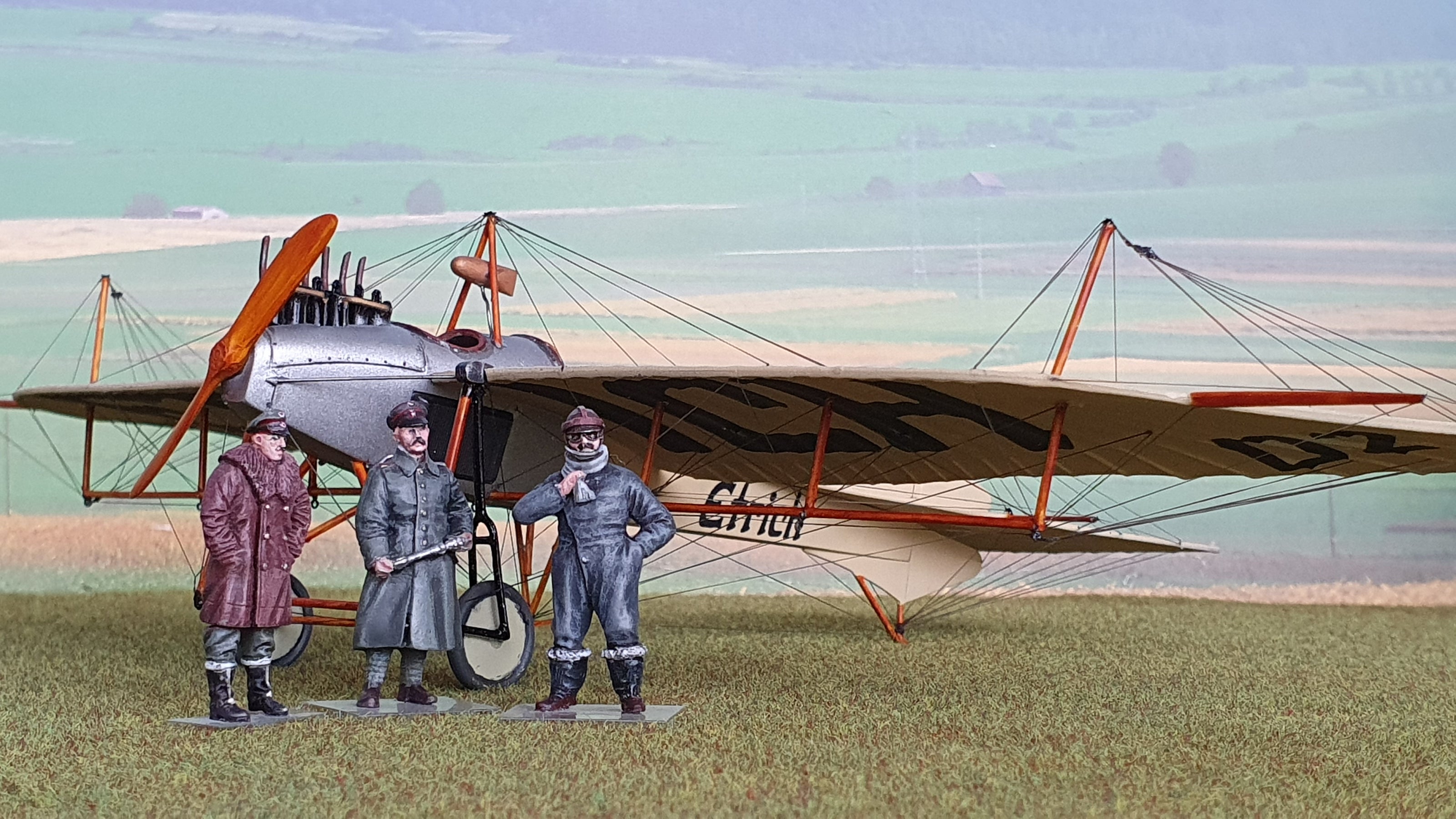 With this first photograph I would like to begin a new series in which I present one of my completed models together with the historical original and the pilots who once flew it. My preferred scale is 1/48, as it offers ample opportunity for refinement while still giving the modeller access to nearly every significant aircraft type of the early pioneering years.For the start of this series, I chose what was probably the first genuine bestseller in aviation history: the Etrich Taube. Shown here with period figures for context and scale, the model captures the unmistakable silhouette that made the Taube such a familiar sight before the First World War. The quiet aerodrome setting evokes those early fields where pilots, mechanics, and aircraft worked side by side at the dawn of flight.